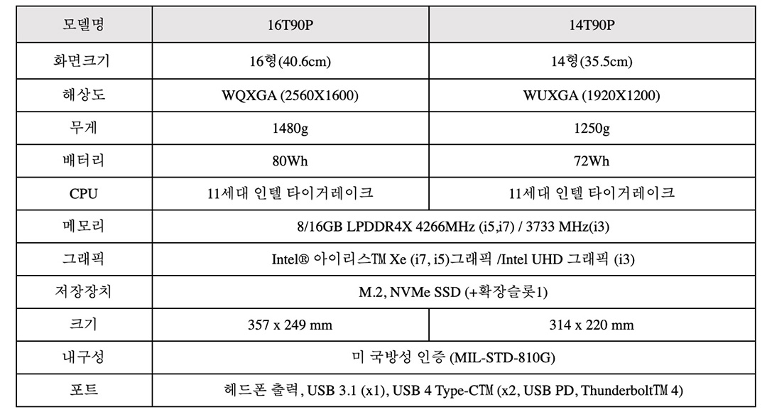 LG 그램 360의 스펙을 보면 인텔 11세대 타이거 레이크, 인텔의 내장 그래픽 프로세서 아이리스 엑스이(Iris Xe)를 탑재 했습니다. 무게를 보면 16인치 치고는 가볍워 보이는 무게로 16형이 1.4kg, 14형은 1.2kg 입니다.
