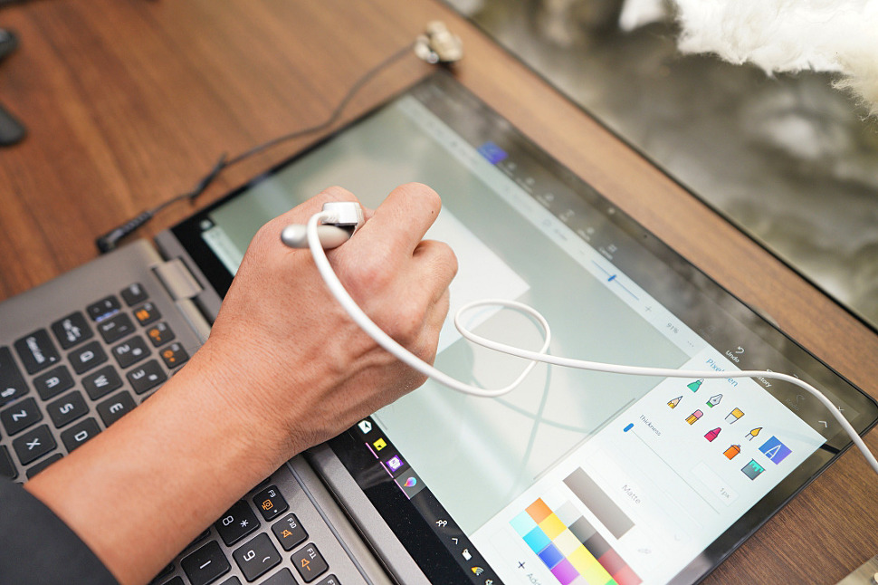 상황에 따라 노트북으로 사용하다 디스플레이가 있는 상판을 회전 윈도 태블릿 모드로 사용할 수 있습니다.