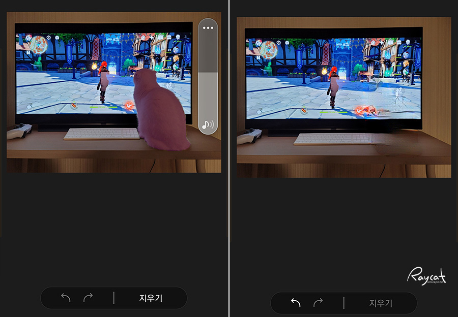 그리고 위 이미지처럼 온쪽에 원본이며 오른쪽은 고양이를 지운 사진인데 고양이가 사라진 책상 부분을 보면 어색하게 보이는 부분이 있습니다. 완벽한 기능은 아니만 가끔 필요할 땐 유용하게 사용할 수 있을것 같습니다.