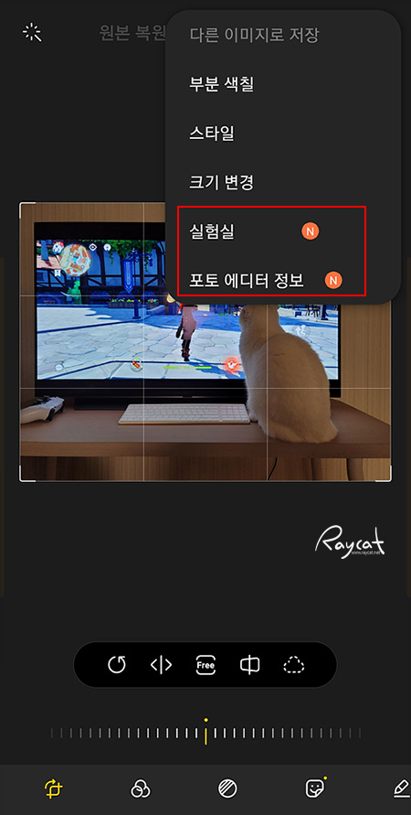 포토 에디터에서 실험실 -> 개체 지우기를 활성화후 갤러리에서 사진 선택 편집을 누르면 포토 에디터가 실행되며 아래쪽 메뉴 선택의 마지막에 개체 지우기 툴이 추가 되었음을 볼 수 있습니다.