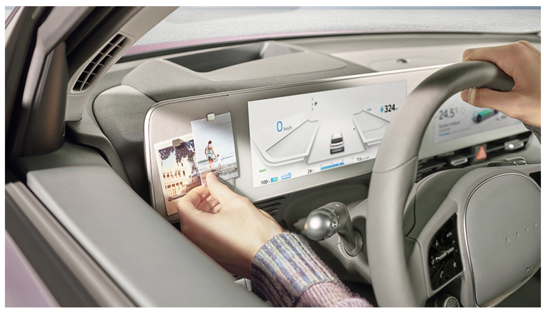 전에 테슬라를 구경 했을때 운전석 계기판과 측면에 태블릿 같은 느낌의 큰 디스플레이가 인상적 이었는데 현대 아이오닉 5의 경우 운전석의 디스플레이가 반으로 나눠져 있는데 자동차의 상태를 보고 네비게이션 역할을 하고 있습니다.