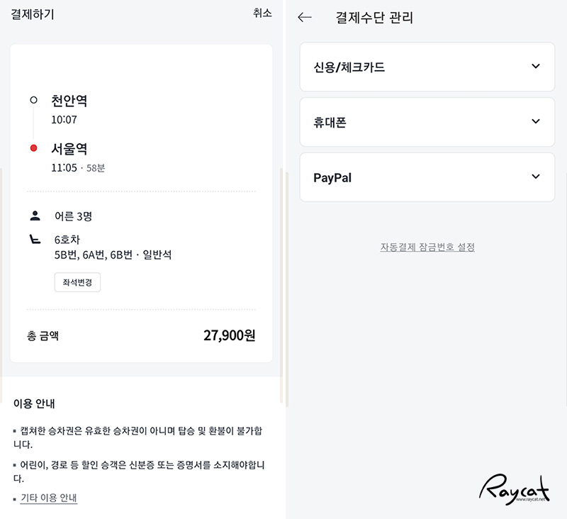 열차선택 -> 구매할 티켓 수 지정 -> 좌석 지정을 하면 결제로 넘어가게 됩니다. 좌석을 자동으로 선택하거나 직접 지정 가능하며 코레일톡과 순서는 비슷합니다. 그래서 기존에 코레일톡으로 기차를 예매하고 있었다면 비슷해서 그런지 큰 차이가 느껴지지 않으며 쉬운편 입니다.