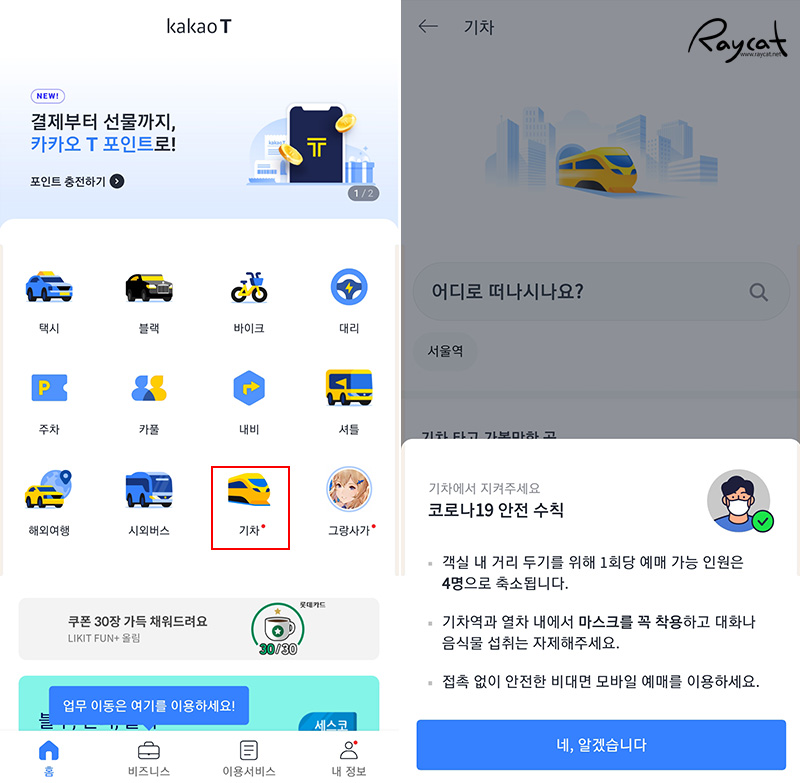 저 같은 경우 보통 지방이나 서울에 다닐때 기차를 많이 이용하고 있어서 주로 모바일 코레일을 사용 했는데 택시를 부를때만 이용하던 카카오T에 기차 예매 서비스가 만들어 졌습니다.