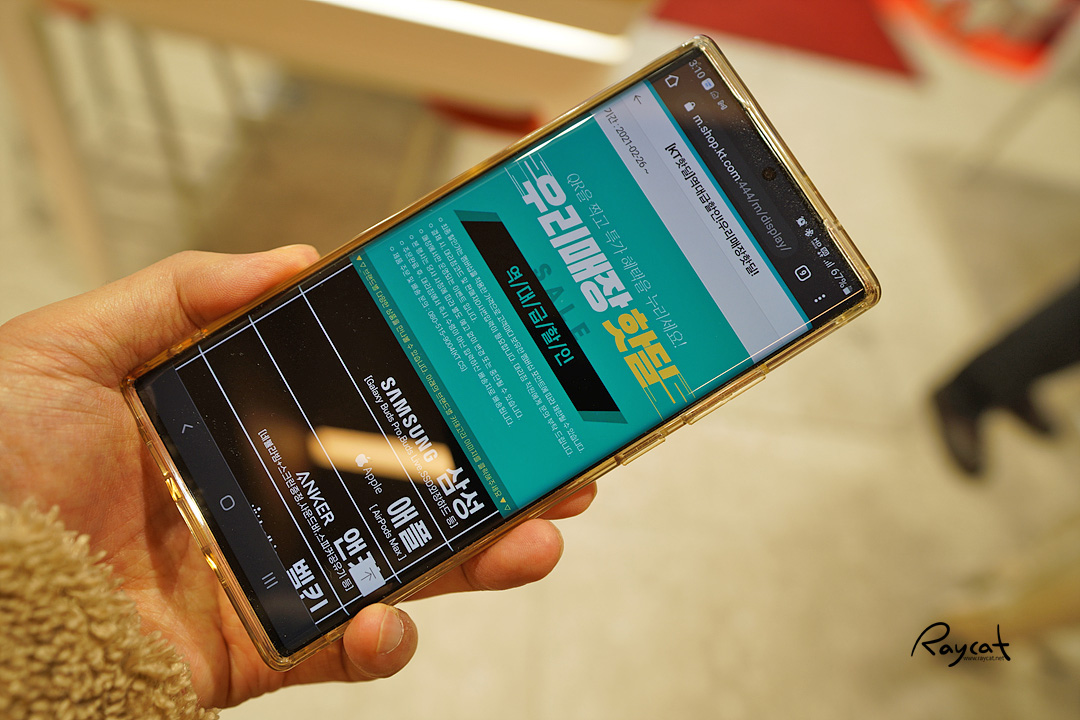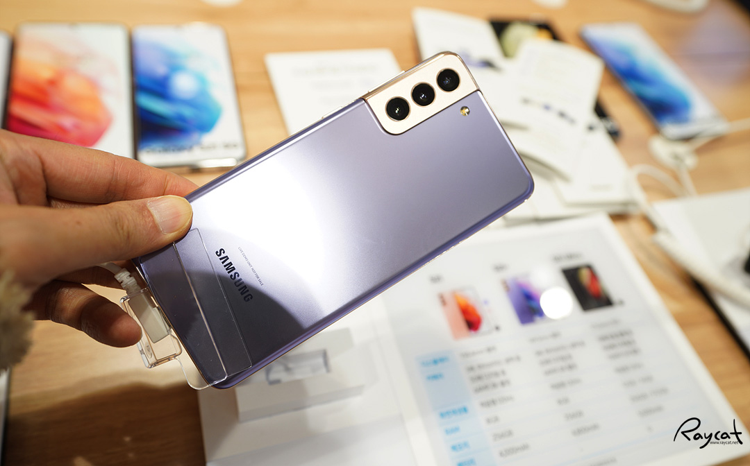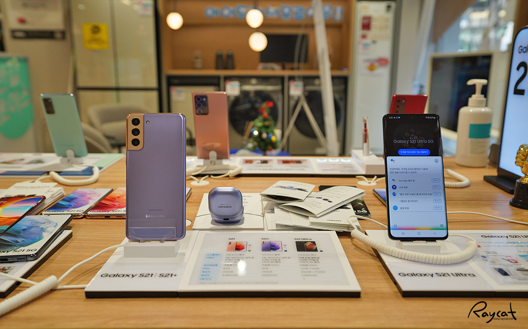 가장 최근에 출시된 단말기가 갤럭시 S21 시리즈죠. s21 울트라와 갤럭시 폴드2까지 모두 전시되어 있는데 갤럭시 S21 바이올렛 컬러가 제일 깔끔한 느낌이 듭니다. 가장 최근에 출시된 스마트폰이라 가장 많이 전시되어 있었는데 갤럭시 S21은 바이올렛 컬러가 실물이 가장 이쁜 듯합니다. 컬러도 은은한 느낌에 조명에 빛 반사를 받으면 반짝반짝한 느낌이 좋더군요.