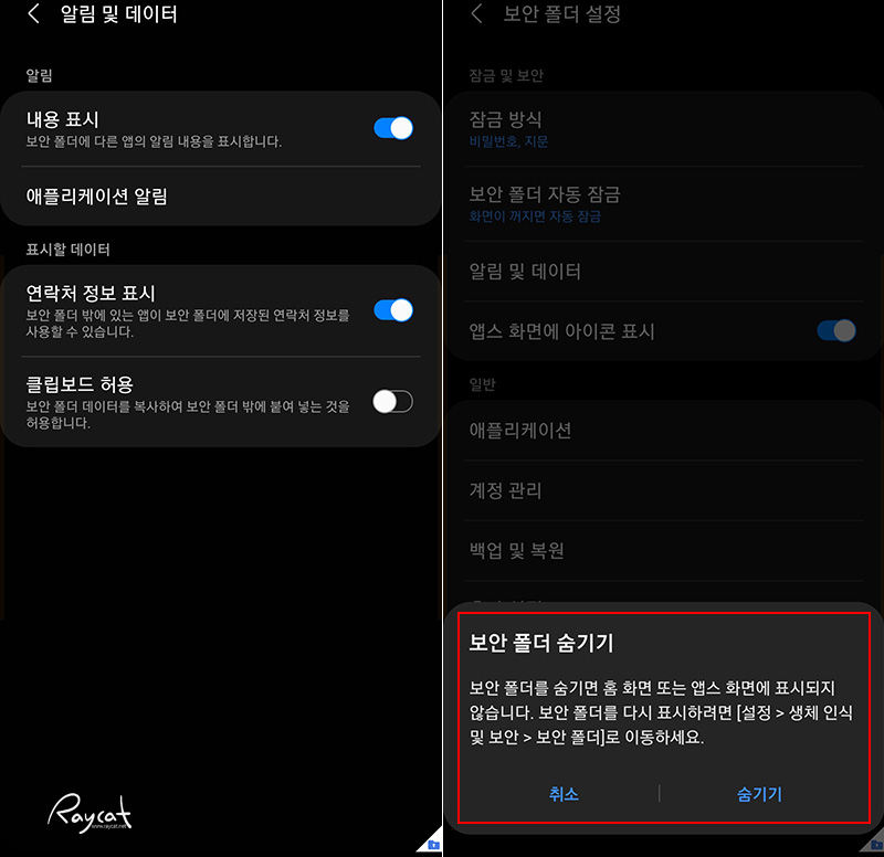 보안 폴더 설정은 간단한데 잠금 방식 설정과 알림 및 데이터 그리고 앱스 화면에 표시 기능이 있습니다.