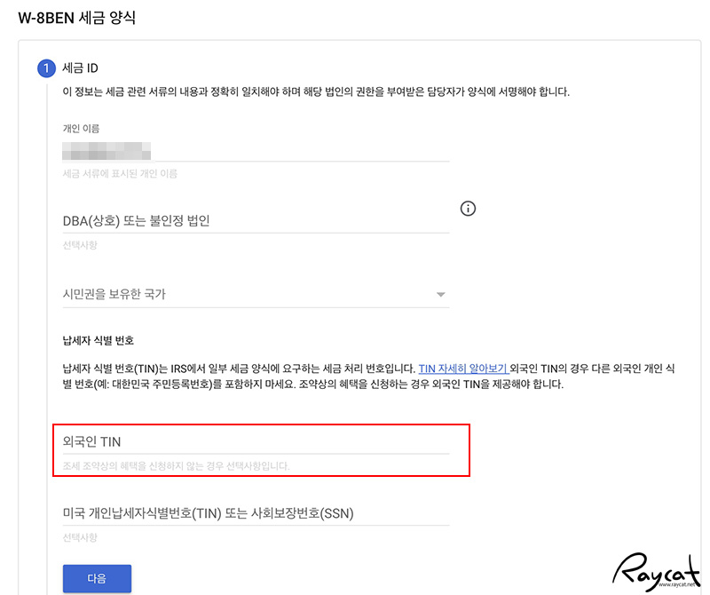 사업자 번호가 없는 분은 한국에서 종합소득세 신고를 하기 때문에 개인도 나중에 TIN을 국내 개인식별 번호 입력을 지원하지 않을까 싶은데 우선은 조세조약 국가를 '아니요'로 선택 등록해두면 될 것 같습니다. 서류 검토후 적격한 수취인의 경우 감면이나 면제가 되기 때문에 추후에 구글에서 알림이 오면 수정을 해도 되니까요.