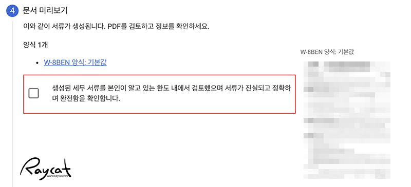 미국에 사업장이 없고 거주하지 않는 외국인은 W-8BEN 세금 양식을 입력하면 됩니다.