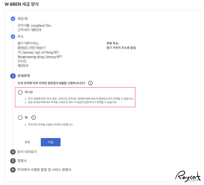 조세조약 국가의 경우 최종 수입에 따라 애드센스 0%, 유튜브 10%, 저작권 수입 10%등 그 비율이 나옵니다. 조세조약 국가가 아닌 경우 일괄 30%를 떼게 되니까 꽤 큰편이죠. 사업자 번호가 있다면 TIN을 입력 했다면 조세조약에서 예를 선택하면 애드센스, 유튜브등 미국법에 따라 세금 감면 비율이 나오면 거기에 동의후 다음으로 넘어가면 됩니다.