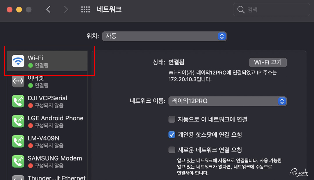 먼저 왼쪽 상단의 애플 로고를 누르고 시스템 환경 설정 -> 네트워크를 엽니다. 네트워크 항목에 보면 저는 여러기기를 연결하고 있어서 복잡하게 나오는데 보통 가장 위에 올라온 Wi-Fi 항목이 지금 맥과 연결된 네트워크 입니다.