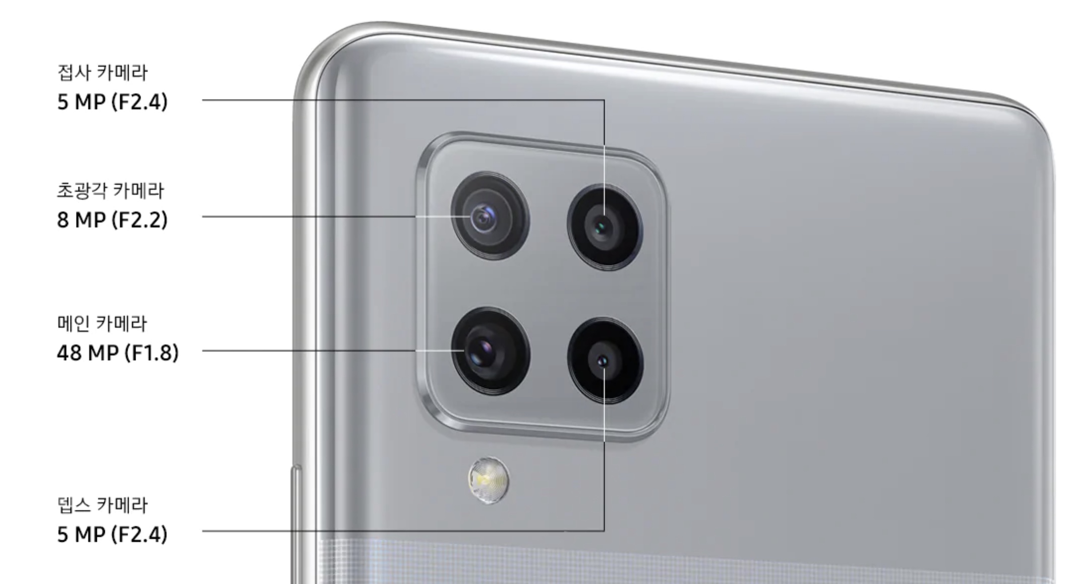 갤럭시 A42의 쿼드 카메라를 정리해 보면 전면 카메라는 2천만 화소, 후면 4800만 화소 일반, 800만 화소 초광각, 500만 화소의 심도 카메라, 500만 화소의 접사 카메라가 있습니다. 참고로 접사 카메라의 3~5cm 까지 초단초점 촬영이 가능합니다.