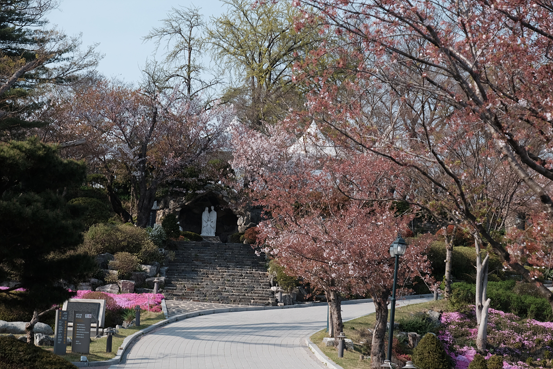 요즘 한참 꽃이 피는 시기라 그런지 성당 주변에도 꽃이 활짝 피었고 벚꽃은 이제 떨어지고 있습니다. 4월 중순이 만개인데 올해는 벚꽃이 좀 일찍 피어서 이제 떨어지고 있습니다.