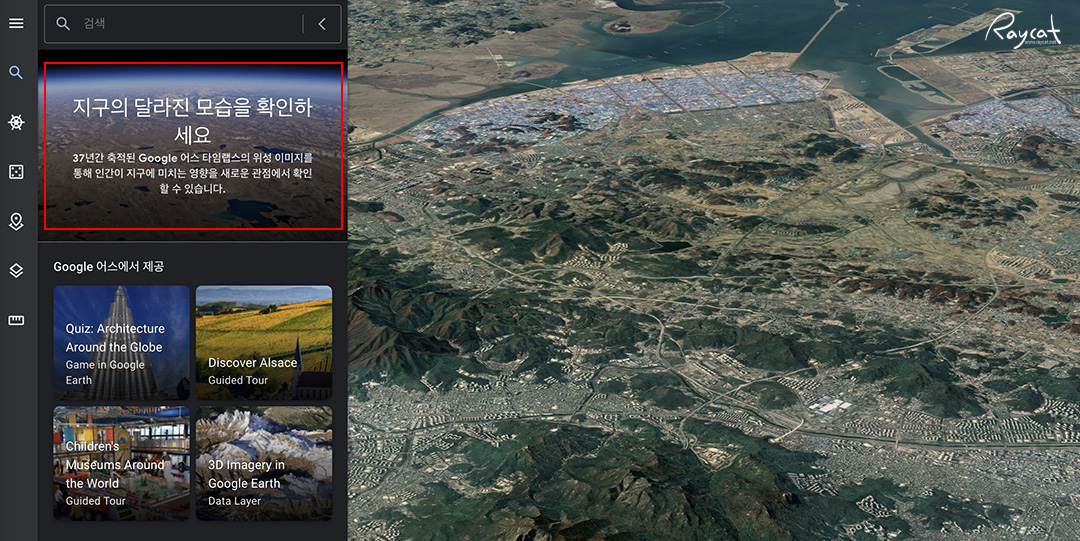 이번 기능은 지난 37년간의 위성 사진을 이용해 시간의 흐름에 따른 지구 표면의 변화상을 이 기능을 활용해 지구 온난화에 따른 빙하 감소나 아마존의 산림 파괴 현황을 볼 수 있습니다. 새롭게 업데이트된 구글 어스는 2400만 개에 이르는 미 항공우주국 나사(NASA)의 위성 사진, 미국 지질조사국의 랜드샛 프로젝트, 그리고 EU의 코페르니쿠스 프로젝트의 도움을 받았다고 합니다.