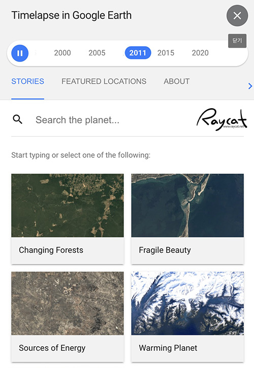 구글어스 타임랩스 기능은 웹버전에서만 사용할 수 있으며 지역명을 입력해 연도별로 재생해 볼 수 있는데 현재 5년 단위로 재생이 됩니다.