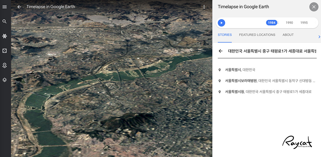 구글어스에서 타임랩스 메뉴를 우측에 타임랩스 패널이 팝업되며 1984년 부터 2020년까지 그 지역의 모습을 순차적으로 보여줍니다. 단 디테일하게 보여주는 것은 지형이 어떻게 변했는지 대략적인 형태를 볼 수 있습니다.