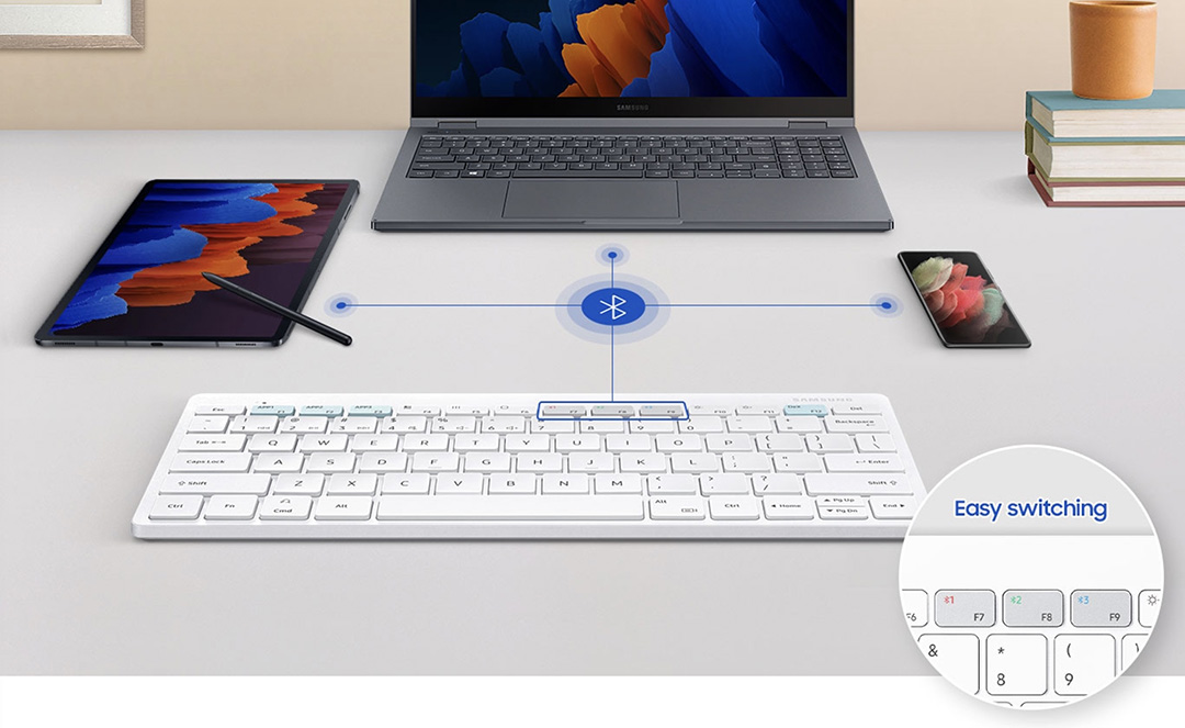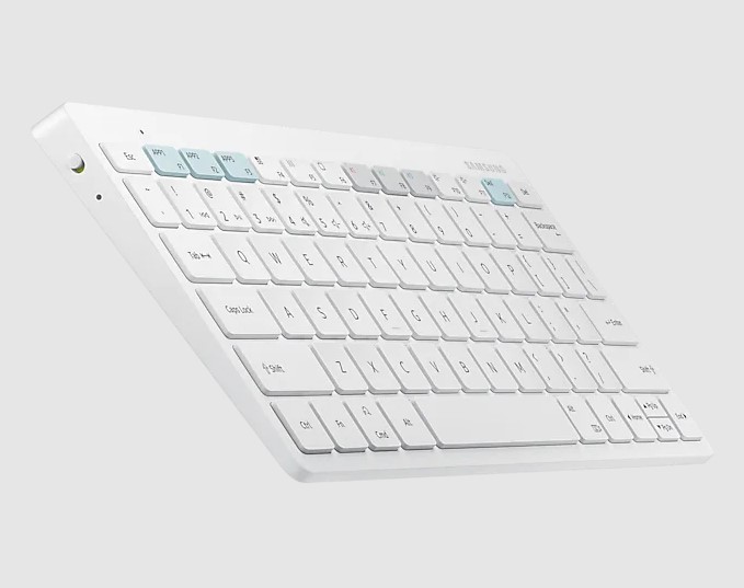 삼성 스마트키보드 트리오 500은 78키의 컴팩트한 레이아웃을 갖고 있는 블루투스 키보드로, 3대의 기기를 페어링해서 버튼으로 쉽게 전환할 수 있는 제품으로 컨셉도 로지텍 k380과 비슷합니다. 단 갤럭시 탭이나 갤럭시 스마트폰에 맞춤된 기능 키를 가지고 있습니다.