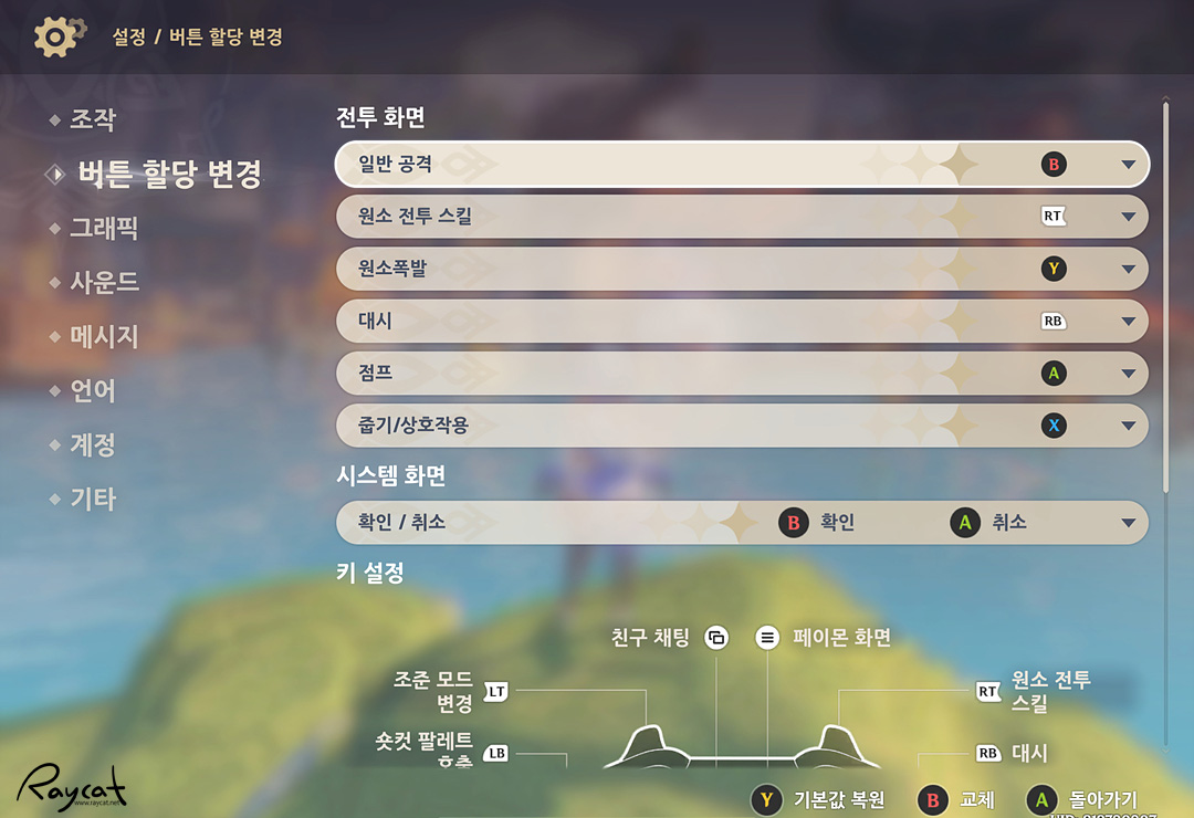 그리고 원신의 경우 듀얼센스 버튼을 변경할 수 있습니다. 손에 익숙한 버튼으로 변경해 사용하는 게 더 편하기도 합니다.