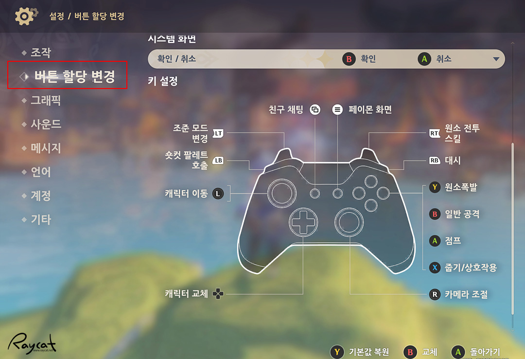 그리고 원신의 경우 듀얼센스 버튼을 변경할 수 있습니다. 손에 익숙한 버튼으로 변경해 사용하는 게 더 편하기도 합니다.