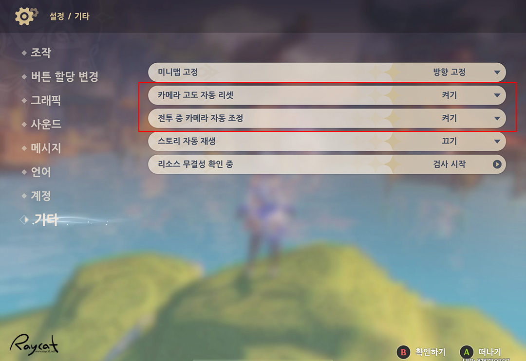 그리고 설정 / 기타 메뉴에서 카메라 고도 자동 리셋, 전투 중 카메라 자동 조정은 모두 끄는 게 좋습니다. 캡처 화면에 지금 기본 설정인 켜기로 돼있지만 제경우 끄고 플레이하는 게 더 편했습니다.