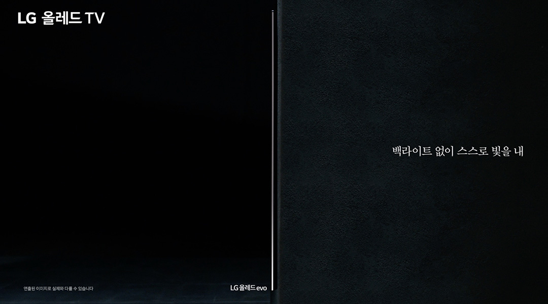 반면, LG 올레드 TV는 백라이트 없이 소자 하나하나가 자발광을 하기 때문에 정확한 블랙 표현이 가능해 무한대에 가까운 명암비를 가지고 있고, 명암비가 높은 만큼 색 재현율도 우수하여 위 광고의 이미지처럼 선명하고 자연스러운 컬러를 생생하게 전달하고 있습니다.
