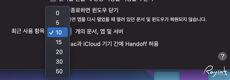 그리고 맥 OS에서 최근 사용 항목 숫자를 지정할 수 있는데 가장 최근에 사용한 앱이나 문서등을 숫자를 지정해 둘 수 있는데 숫자를 높게 설정할수록 시스템 메모리를 많이 사용하게 되고 캐시 메모리를 더 차지하게 됩니다.