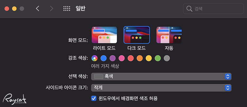 참고로 여기서 강조 색상을 흑색으로 하면 눈에 피로도 덜합니다. 그리고 자동 모드를 선택하면 라이트 모드와 다크 모드가 시간대별로 다르게 적용됩니다. 개인차가 있겠지만 한가지 모드로 선택해 사용하는게 제 경우 더 편했습니다.