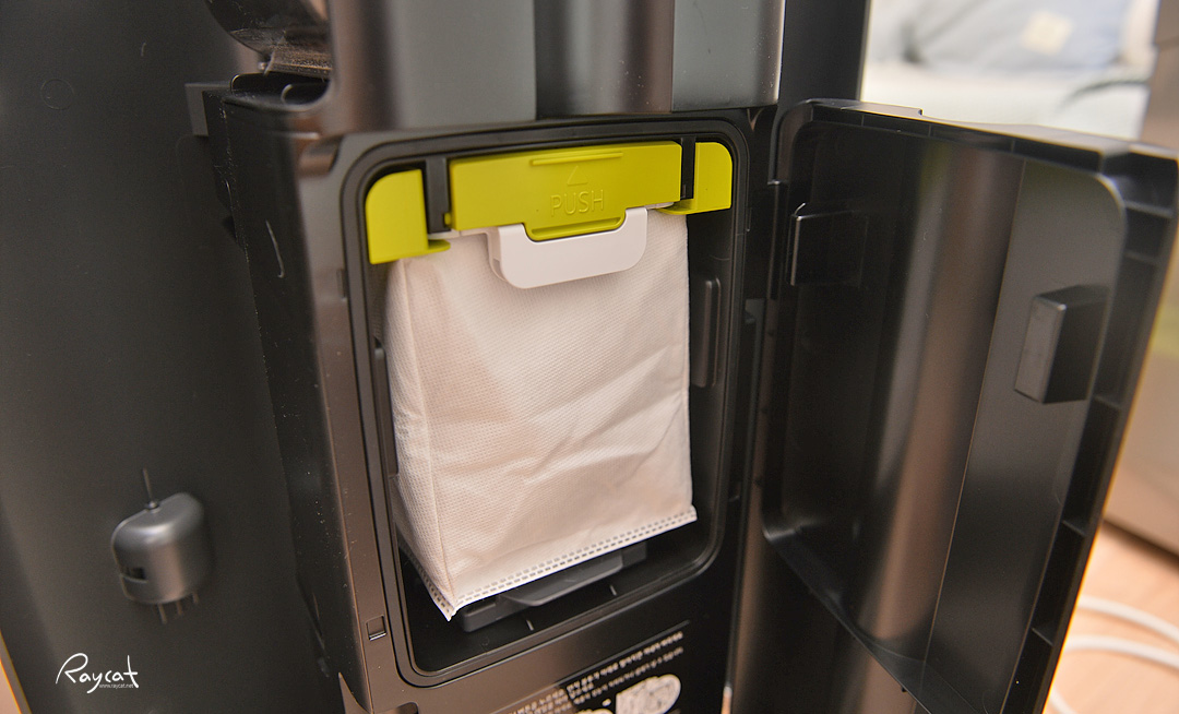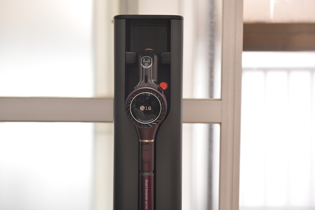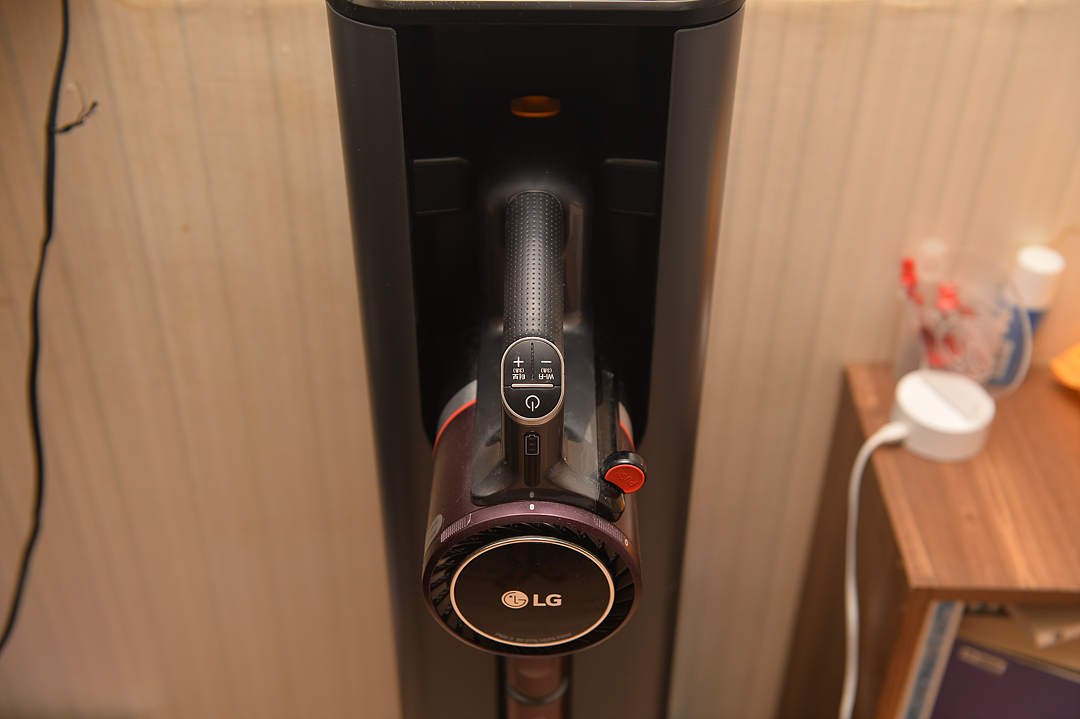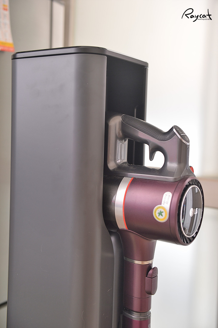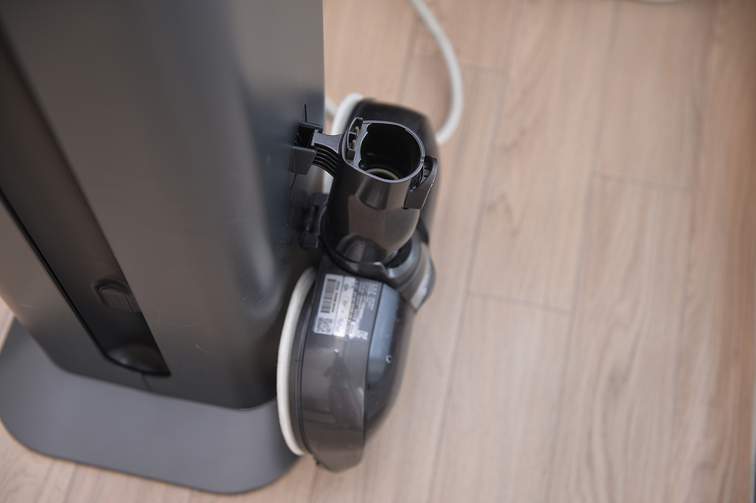 청소기를 올인원 타워의 안쪽 충전 단자에 맞춰 끼우면 자동으로 충전이 되며 먼지비움을 누르면 안쪽에 뚜껑이 열리며 먼지통에 쌓인 먼지를 빨아 당겨서 올인원 타워의 먼지 봉투에 쌓이게 됩니다.
