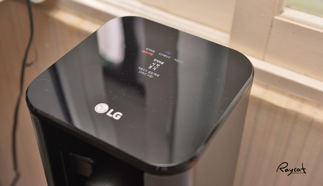 올인원 타워의 기능은 간단한데 A9나 A9S를 올인원 타워에 거치하고 먼지비움 버튼을 누르면 A9S의 먼지통에 쌓여있는 먼지를 빨아 당겨서 비우게 됩니다. 상단의 조작부가 하이그로시 터치 패널인데 먼지나 동물 털이 좀 붙는 편입니다.