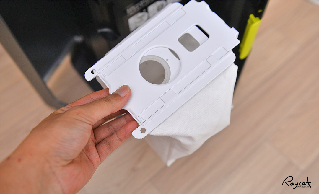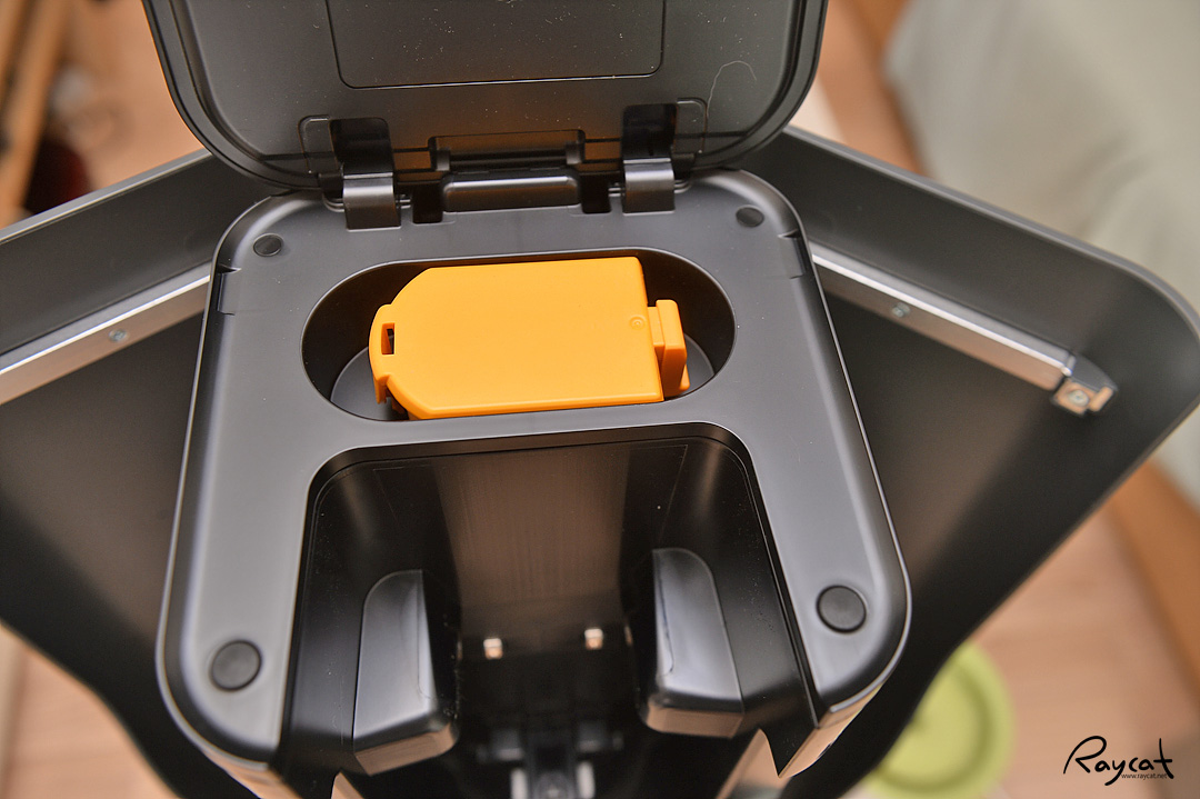 올인원 타워에 먼지를 자동으로 비우기 때문에 뚜껑에 스프링이 달려있어서 자동으로 열리는 부품으로 교체하게 됩니다. 먼지통 안에 설치된 필터는 기존 먼지통에 있던 필터보다 조금 작은 크기로 바뀌더군요.