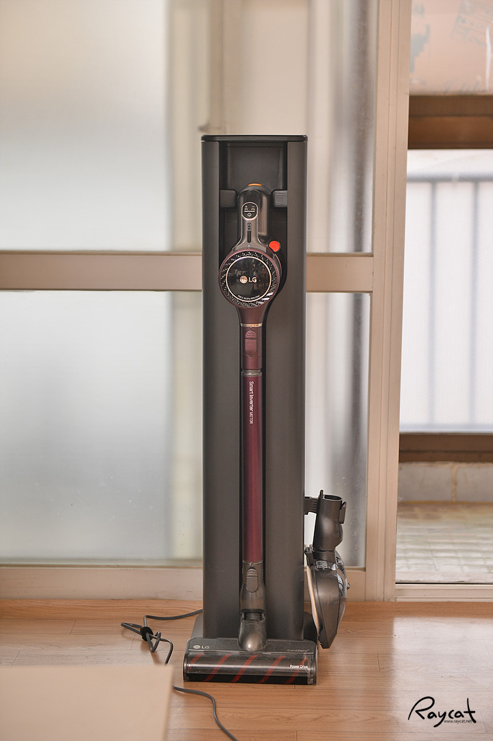올인원 타워에 청소기를 거치하면 위 사진처럼 저런 형태가 되는데 앞쪽으로 좀 튀어나오기 때문에 양쪽 사이드 그리고 앞쪽에 공간이 조금 필요합니다. 안쪽에 다른 청소용 툴을 수납하기 때문에 크기는 조금 큰 편이기도 합니다.