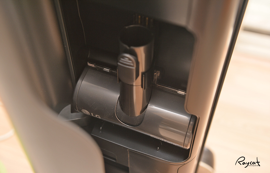 청소기를 올인원 타워의 안쪽 충전 단자에 맞춰 끼우면 자동으로 충전이 되며 먼지비움을 누르면 안쪽에 뚜껑이 열리며 먼지통에 쌓인 먼지를 빨아 당겨서 올인원 타워의 먼지 봉투에 쌓이게 됩니다.
