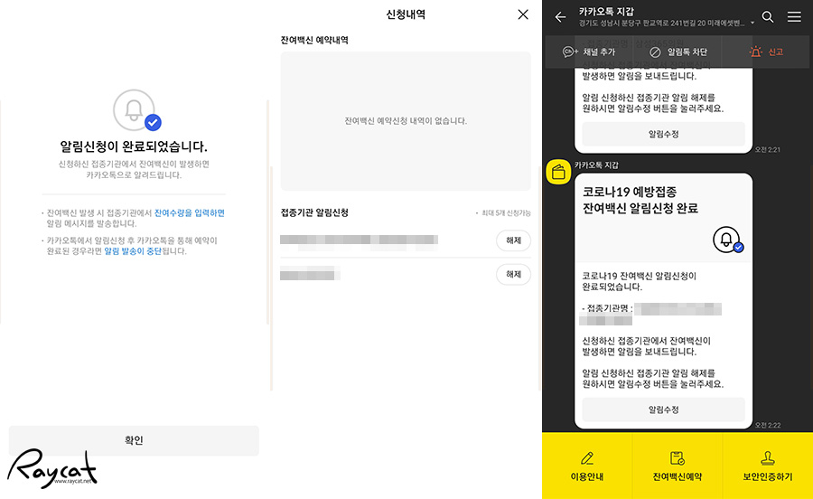 알림신청이 완료되면 위 캡처 이미지처럼 접종기관명과 함께 카카오톡으로 알림신청 완료 메세지가 옵니다. 알림신청한 병원을 바꾸고 싶으면 해제후 다시 신청하면 됩니다. 잔여백신이 많지 않을까 생각했는데 의외로 잔여백신이 있는 병원이 없더군요.