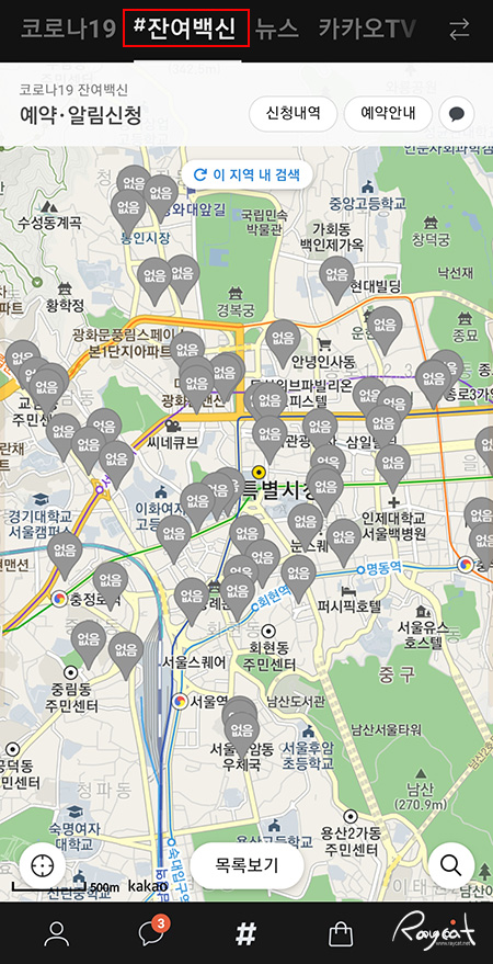 카카오 메인 메뉴에서 #잔여백신 메뉴에 들어가면 바로 지도가 나오며 인근 병원에 백신이 있는지 볼 수 있는데 현재 위치에서 보여지는 병원에는 잔여백신이 하나도 없네요. 현재 잔여백신은 아스트라제네거 입니다.