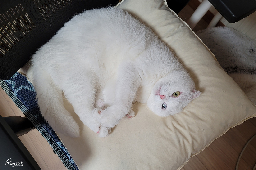 고양이가 의자 자체를 완전히 자신의 영역으로 생각하는듯 하다. 쿠션을 바꿔도 의자 위치를 바꿔도 꼭 이 의자만 고집하는거 보면 어지간히 마음에 드는 모양이다.