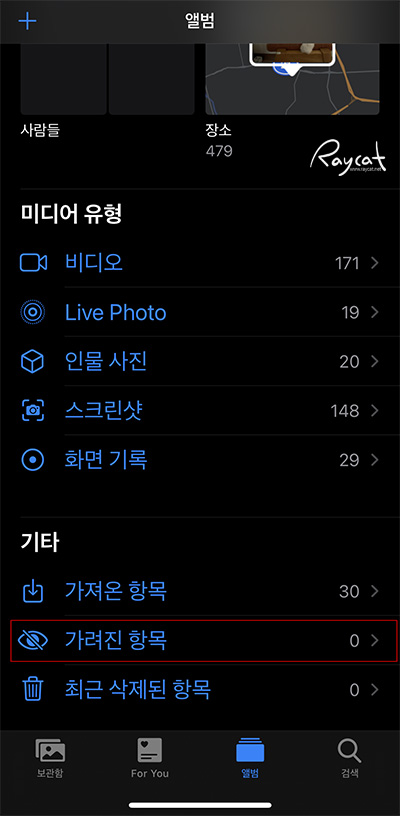 갤러리에서 가려진 사진이나 영상은 앨범 가려진 항목에서 볼 수 있습니다.