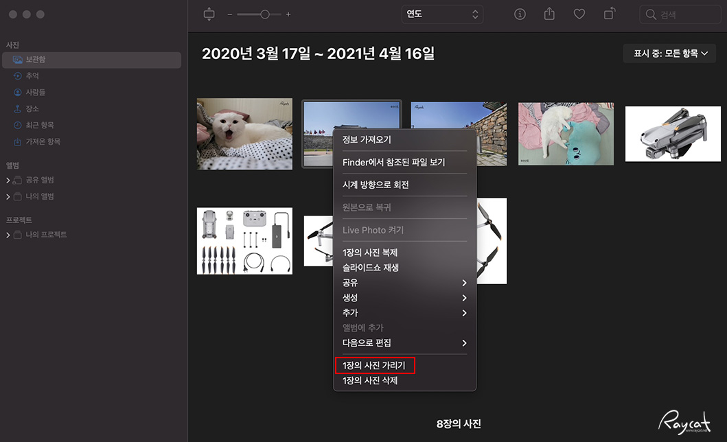 아이폰과 동일하게 사진 앱에서 보관된 사진을 선택합니다. 사진을 control-클릭하고 '사진 가리기'를 선택합니다. 또 위 이미지처럼 메뉴 막대에서 이미지 > 사진 가리기를 선택하여 사진을 가릴 수 있습니다.