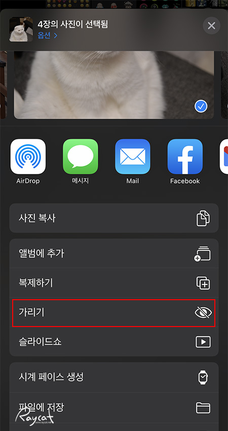 사진을 선택후 하단의 공유 버튼을 탭하면 위 캡처 화면과 같이 복사, 추가, 가리기, 슬라이드쇼등이 나오는데 가리기를 선택하면 갤러리에 사진이 보이지 않게 됩니다. 갤러리에서 숨겨진 사진은 '가려진 항목' 앨범에서 볼 수 있으며 동영상도 동일하게 적용됩니다.