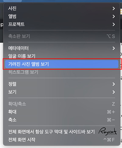 참고로 맥에서 가려진 사진이나 앨범은 기본으로 꺼져 있습니다. 가려진 앨범이나 사진을 다시 사진 앱에서 보고 싶다면 사진 앱을 열고 보기 > 가려진 사진 앨범 보기를 선택합니다.