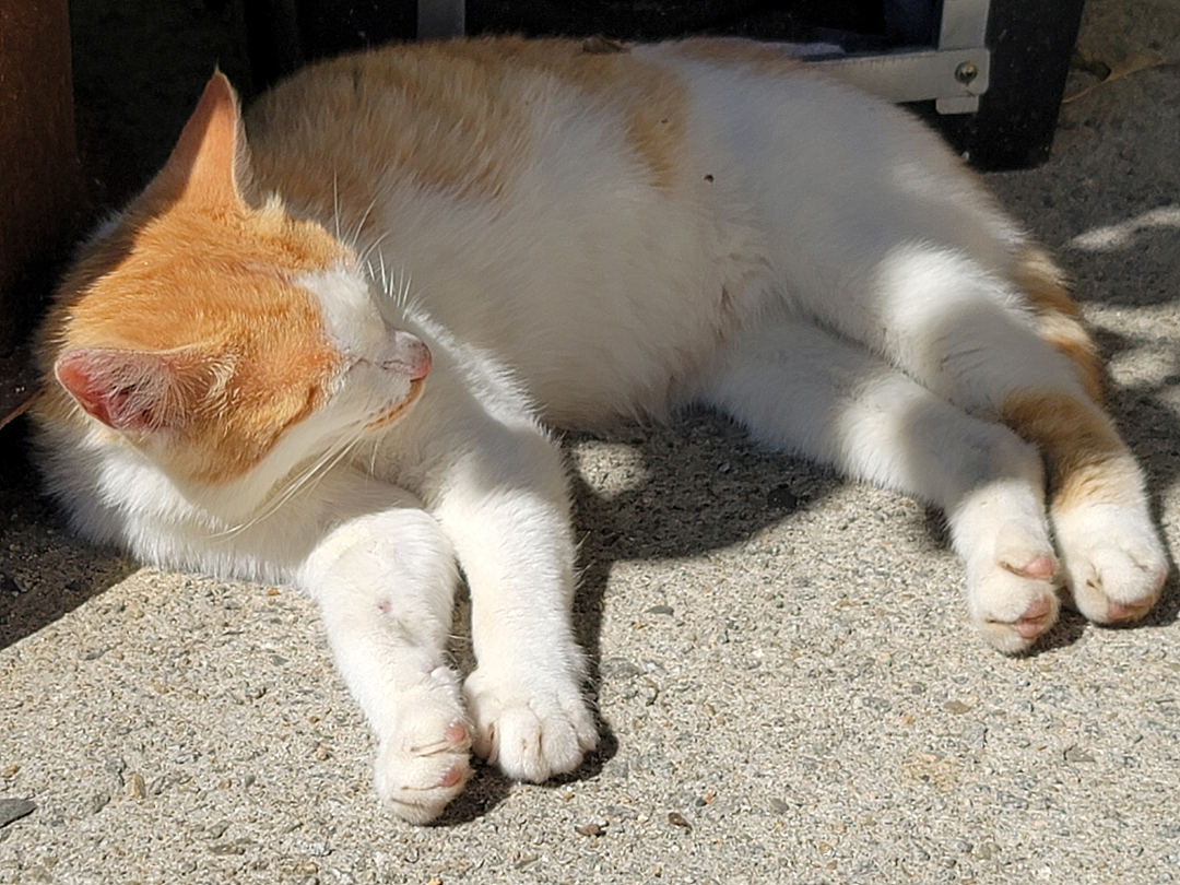 하루에 2번 사료를 그릇에 놔두고 가는데 이미 다 먹고 휴식중이다. 사료가 나오는 시간이면 다 모이는데 밥 먹고 나면 주변으로 흩어져 휴식을 취한다. 시골 고양이들이라 그런지 원래 여기저기 돌아다니다 밥 시간이 되면 우르르 몰려와 밥 먹고 사라지곤 하는데 요즘 날씨가 따뜻해서 그런지 밥 먹고 바로 시원한 그늘이나 햇볕이 따뜻한 자리를 찾아가 드러누워 버린다.
