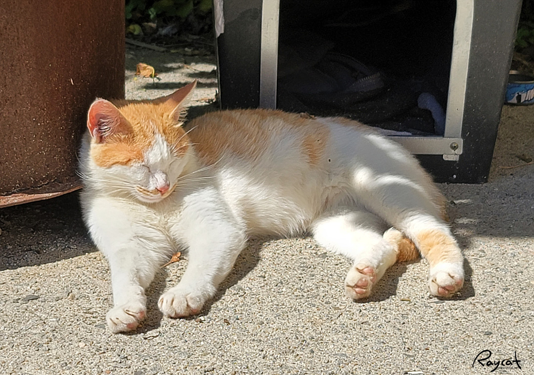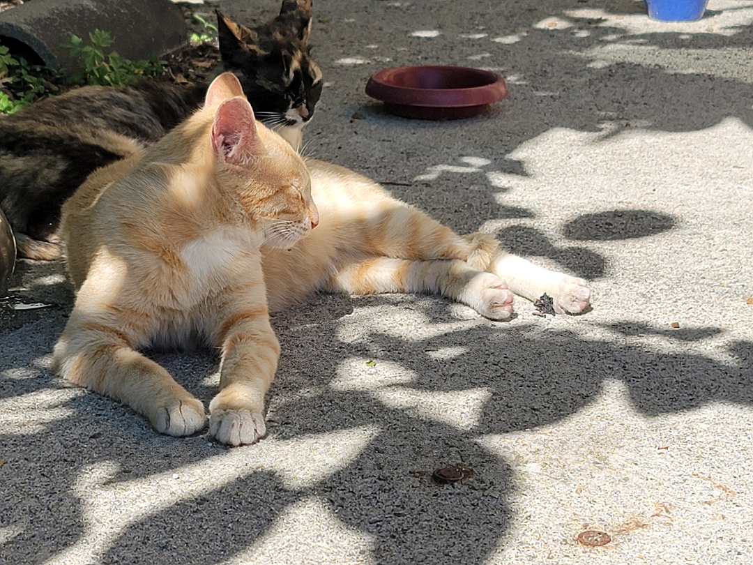 하루에 2번 사료를 그릇에 놔두고 가는데 이미 다 먹고 휴식중이다. 사료가 나오는 시간이면 다 모이는데 밥 먹고 나면 주변으로 흩어져 휴식을 취한다. 시골 고양이들이라 그런지 원래 여기저기 돌아다니다 밥 시간이 되면 우르르 몰려와 밥 먹고 사라지곤 하는데 요즘 날씨가 따뜻해서 그런지 밥 먹고 바로 시원한 그늘이나 햇볕이 따뜻한 자리를 찾아가 드러누워 버린다.