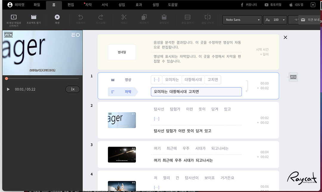 Vrew의 자동자막 생성의 원리는 간단한데 영상을 에디터로 불러와 재생을 하면 인공지능이 영상 속에 음성을 분석해 자동으로 자막을 만들어 줍니다.