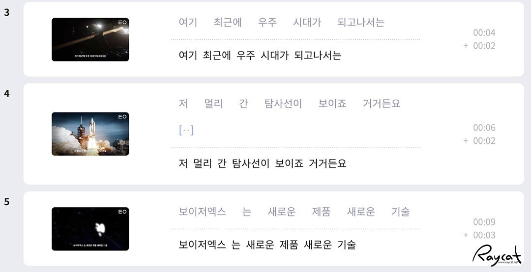 컷 별로 구간별로 자막을 만들어 주며 의외로 발음이 정확하면 상당히 깔끔하게 잘 만들어집니다.