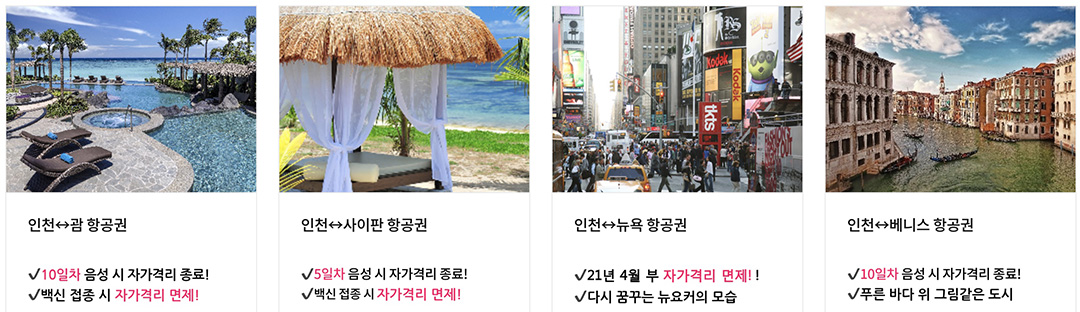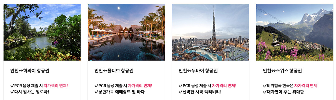 백신 접종과 함께 PCR 검사 음성 제출시 자가격리 면제가 가능한 곳이 있는데 하와이, 몰디브, 두바이, 스위스가 있습니다.