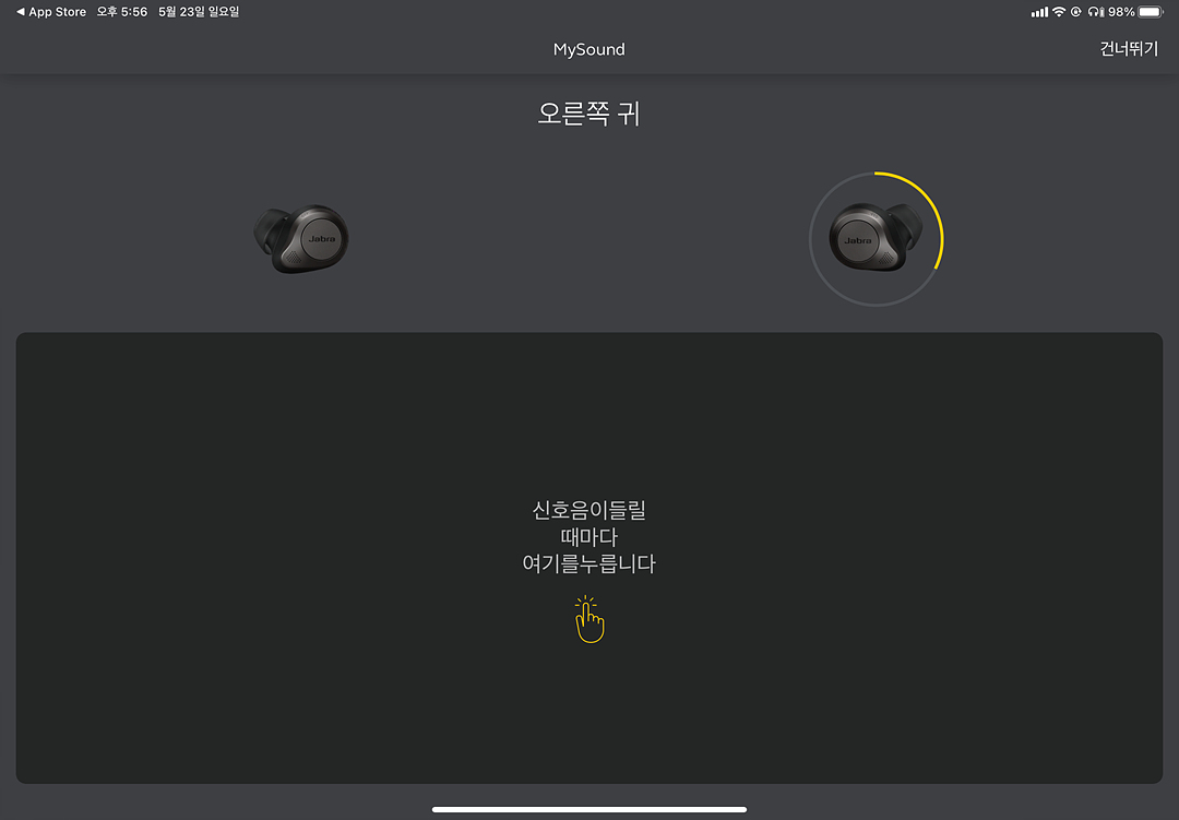 테스트는 간단하게 진행되는데 이어버드를 착용하고 아래쪽의 진행을 탭하면 바로 테스트가 시작됩니다.