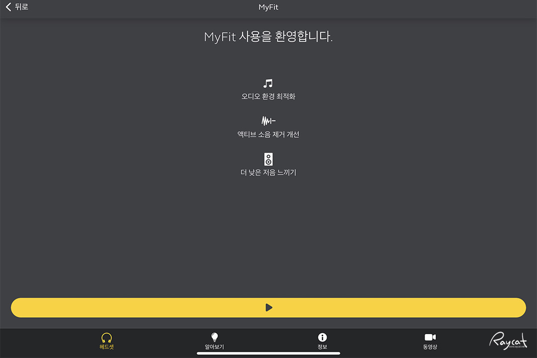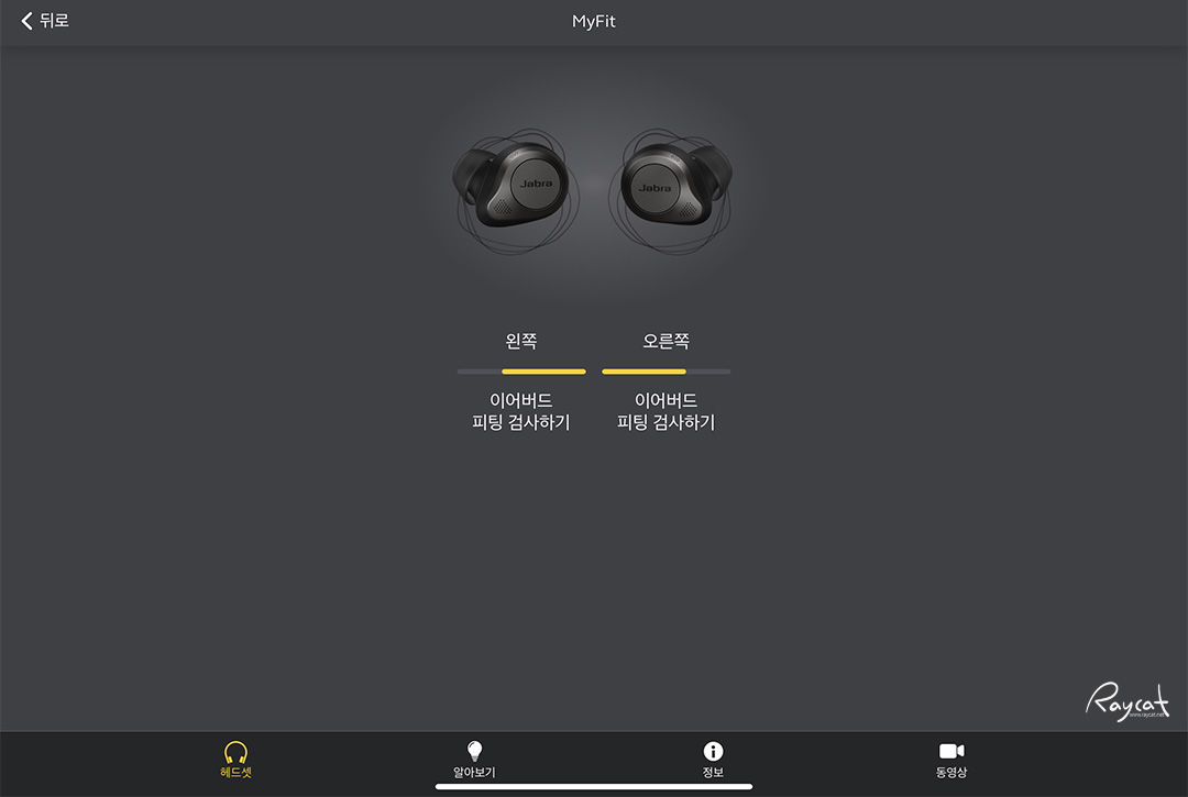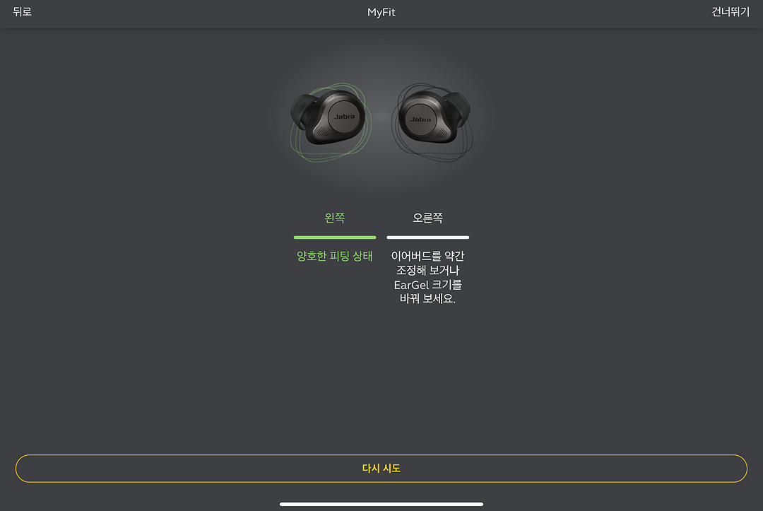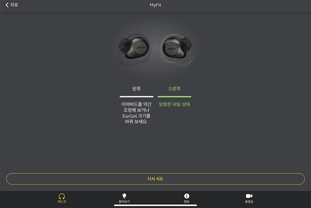 앱을 설치하고 이어폰을 연결후 설정에서 my fit이란 메뉴를 탭하면 이어버드에 귀에 제대로 밀착이 되었는지 체크해 볼 수 있습니다.
