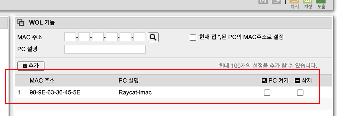 WOL 기능으로 최대 100대의 기기까지 설정할 수 있는데 보통 일반 가정이면 1~2대 정도 설정해서 사용하게 됩니다.