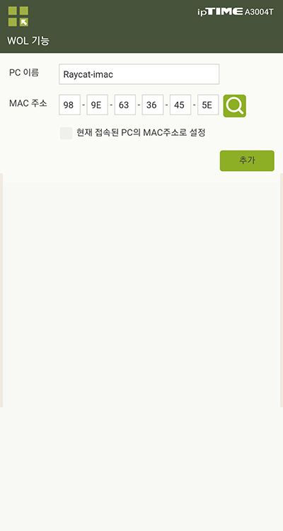 WOL 기능에서 MAC 주소란게 있는데 돋보기 즉 검색 아이콘을 누르면 공유기에 접속된 디바이스를 확인할 수 있습니다.