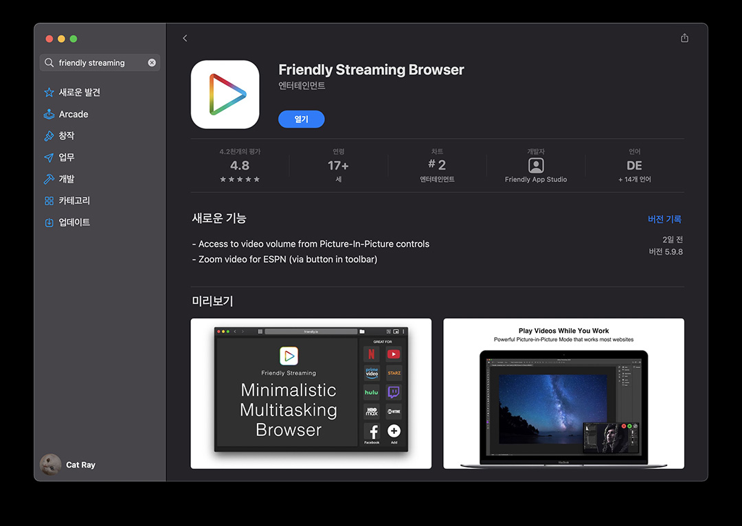 넷플릭스나 유튜브처럼 맥에서 앱 제공없이 웹브라우저만 서비스를 제공하는 서비스 때문에 사용했는데 지금은 트위치도 이걸로 보고 있습니다.