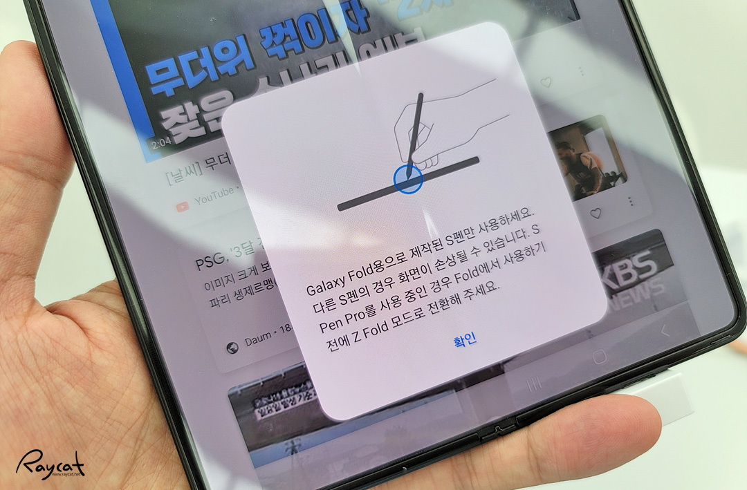 참고로 갤럭시 노트에 사용하는 S펜을 갤럭시 Z 폴드3에 접촉하면 인식을 하지 않으며 위와 같은 팝업 메시지가 나옵니다. 폴드용 S펜을 제외한 다른 S펜은 사용하지 말라는 경고가 나옵니다.
