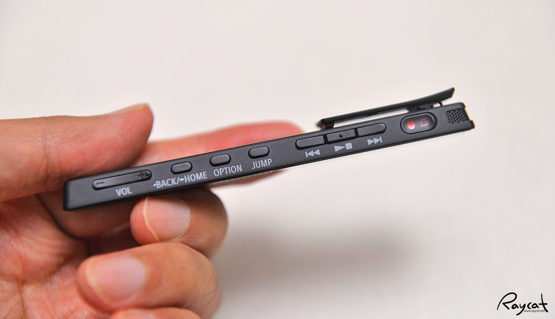 측면에 볼륨 버튼, 보이스 레코더 메뉴 조작 버튼과 점프, 원터치 레코더 녹음 버튼 등이 있습니다. 붉은색 녹음 버튼을 누르면 바로 녹음이 시작됩니다.
