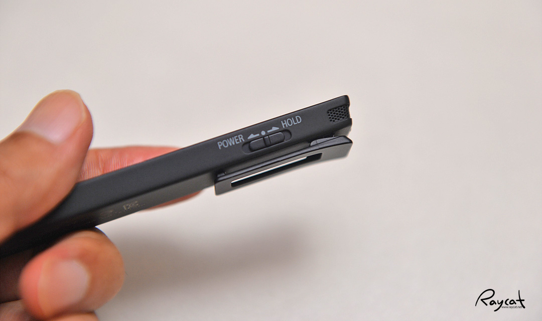 측면에 볼륨 버튼, 보이스 레코더 메뉴 조작 버튼과 점프, 원터치 레코더 녹음 버튼 등이 있습니다. 붉은색 녹음 버튼을 누르면 바로 녹음이 시작됩니다.